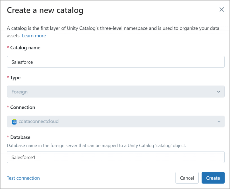 Click Create. If the catalog creation succeeds, a confirmation dialog appears. Click View catalog to view your new catalog.