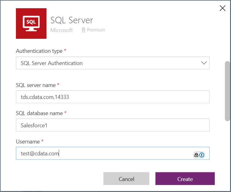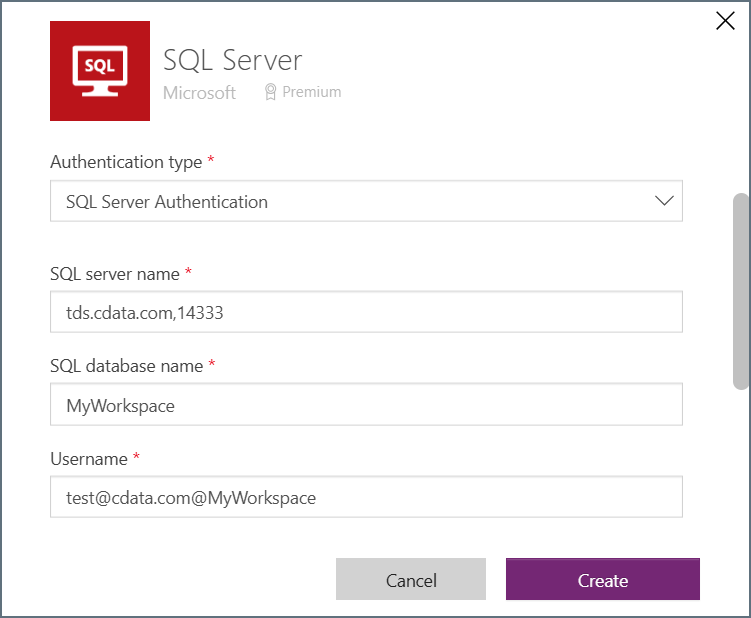 - SQL server name—enter the Virtual SQL Server endpoint and port separated by a comma: tds.cdata.com,14333