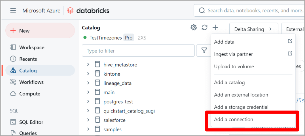 ナビゲーションペインでカタログを選択します。+ アイコンをクリックし、接続を追加を選択します。