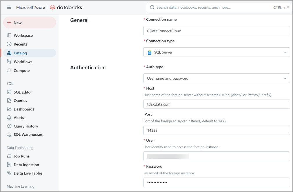 Databricks Lakehouse Federation からConnect AI の仮想SQL Server API へのコネクションを確立するには以下の手順に従います。1