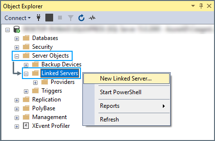 In the Object Explorer pane, open Server Objects, right-click Linked Servers, and select New Linked Server.
