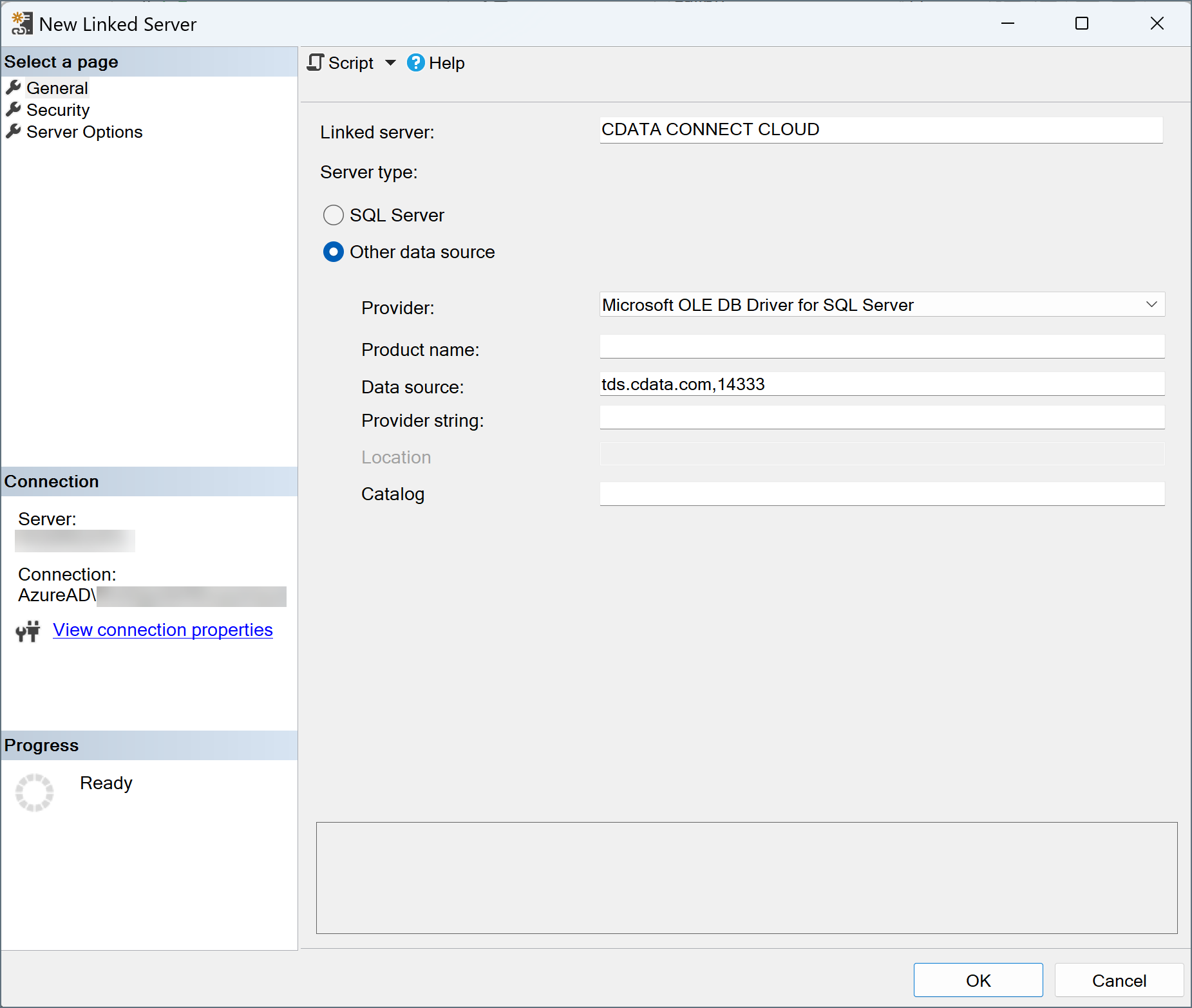 The New Linked Server dialogue opens. On the General page, enter the following information: