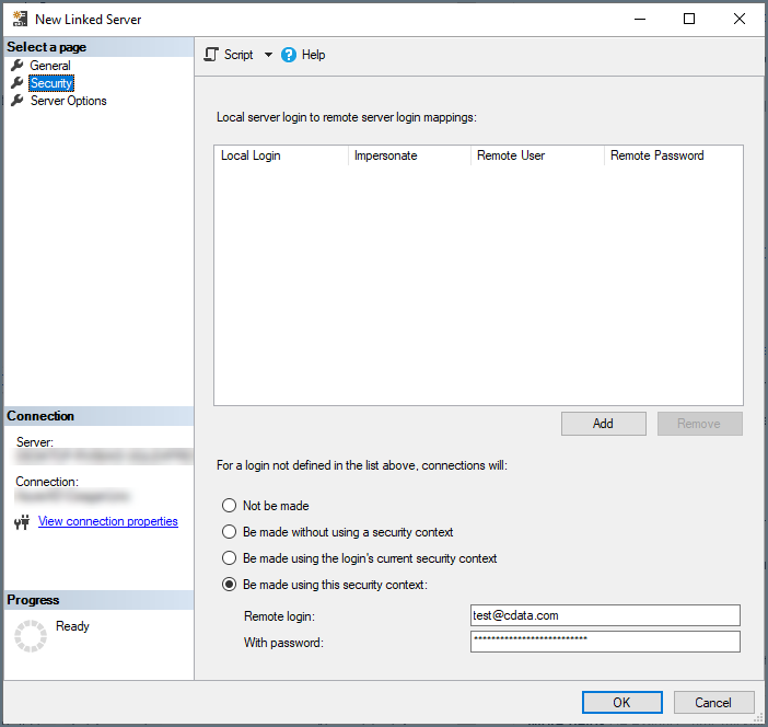 SQL Server Linked Server からConnect AI の仮想SQL Server API へのコネクションを確立するには以下の手順に従います。1